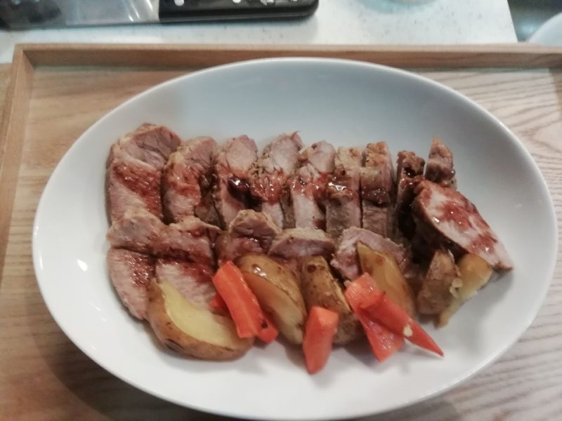 大きさは適当な大きさに分けて、オーブンで焼いた野菜も適当に添えてグレイビーソースをかければ出来上がり。