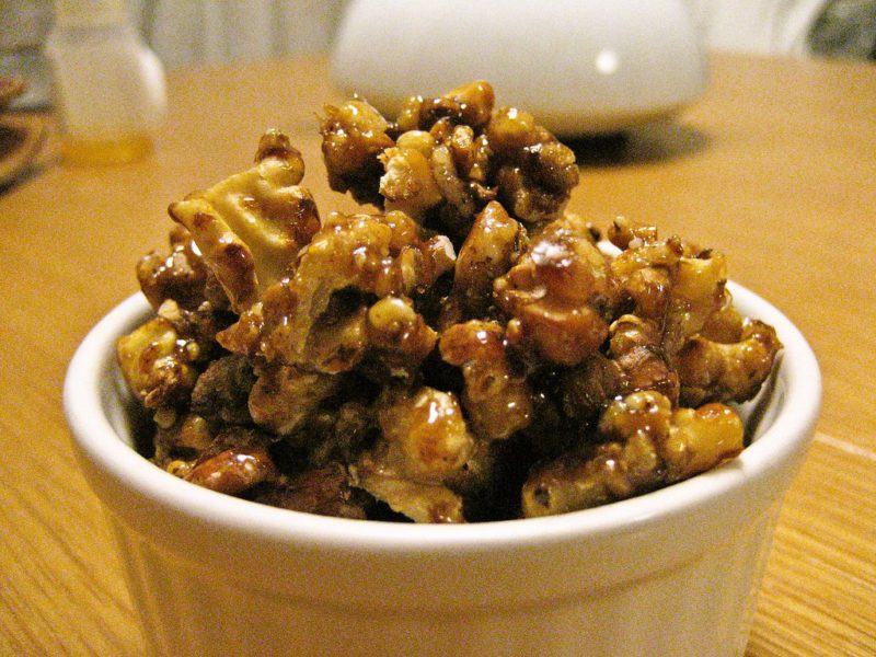 このまま食べてもうまい。くるみ以外のナッツ類を混ぜてやるともっとうまい(ただし材料費が高くつく)。製菓の素材にもなるので、分量の2倍くらい作っておいてもよい。保存する場合は一週間を目安にきれいな瓶などにいれておく